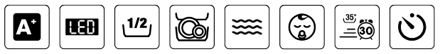6 programs: Quick, Eco, Intensive, Glasses, 90-min Wash, Self-cleaning